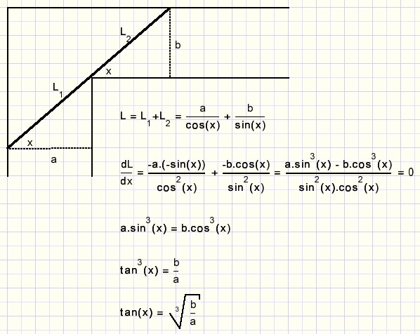 We berekenen de minimum lengte L van de doorgang bij verschillende hoeken x.