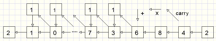 A[N] wordt vermenigvuldigd met 2, het product gaat naar A[N+1] (laagste cijfer) en A[N+2] (carry).