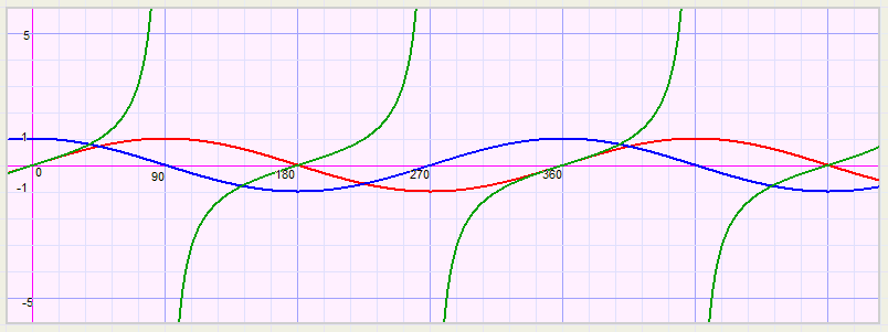 Hieronder staan de grafieken van sin(x), cos(x) en tan(x) bij elkaar