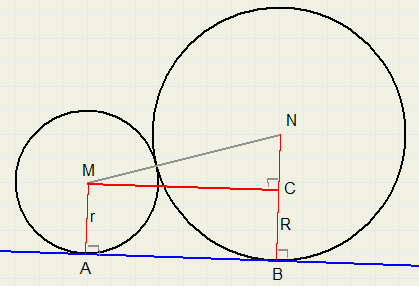 MA = r NB = R NC = R - r ..............................{ABCM is een rechthoek} MN = R + r (raaklijn is niet getekend) MN is dus een rechte lijn. Toepassing van de stelling van Pythagoras in DMCN: