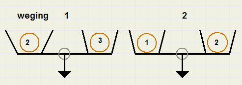 Stel , dat wegingen "LL" hoort bij de situatie "munt 1 zwaarder". Dan hoort "RR" bij "munt 1 lichter".