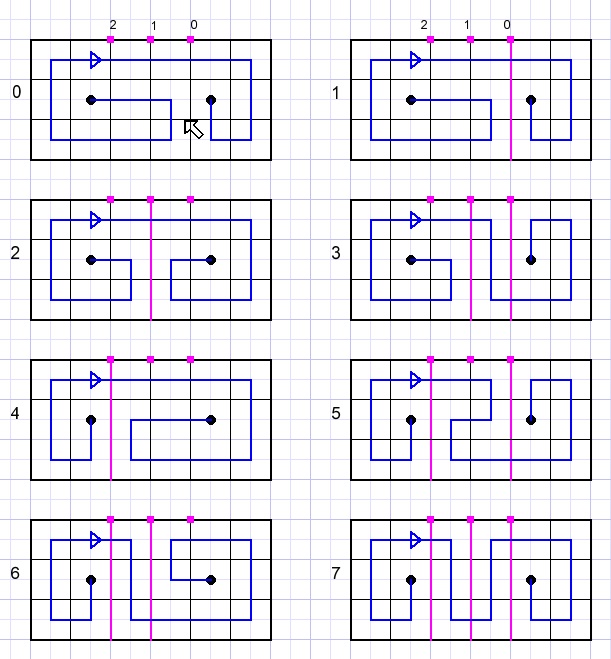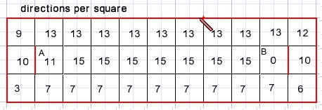Bij elk vierkantje (square) is er een getal dirs dat aangeeft in welke richtingen (1,2,4,8) een pad mag lopen: