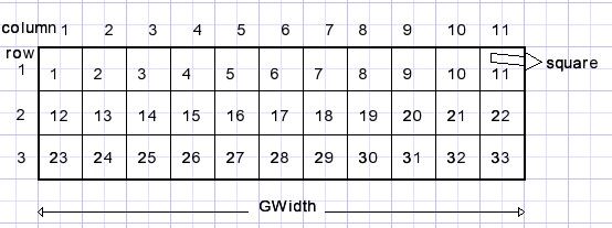 Vierkantjes zijn genummerd zoals hieronder aangegeven (voor een 11 kolommen puzzel):