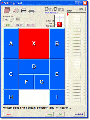De positie van de blauwe blokken is niet van belang. Op sommige websites kan de puzzel on-line worden gespeeld, maar dat is wegens de onhandige bediening zonder muis een lastige zaak. Ook kunnen geen zetten teruggenomen worden en een oplossing kan niet worden nagespeeld. Mijn SHIFT programma kent de volgende mogelijkheden: